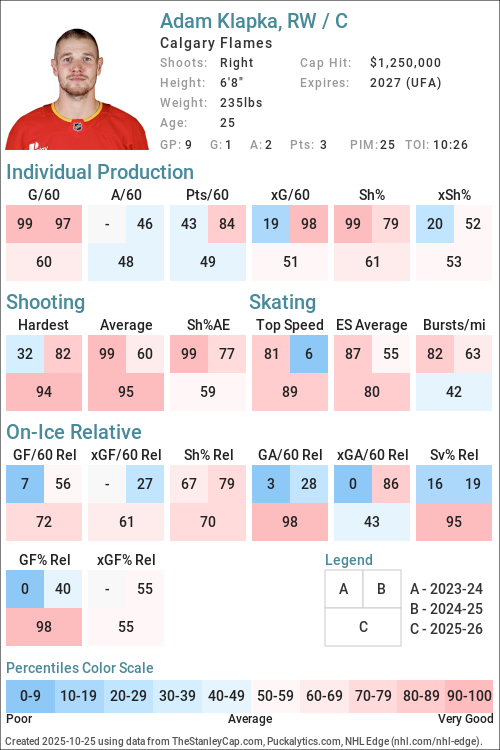 Comparing the Calgary Flames’ 2024-25 and 2025-26 opening night rosters at The Win Column (Thu Oct 9, 2025)