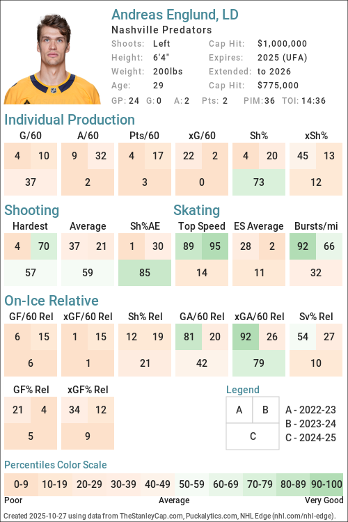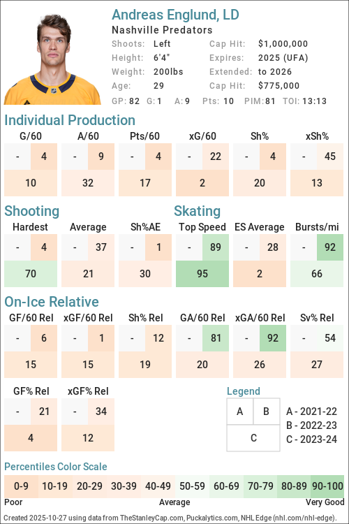 Percentiles are determined by comparing Forwards to Forwards and Defensemen to Defensemen.