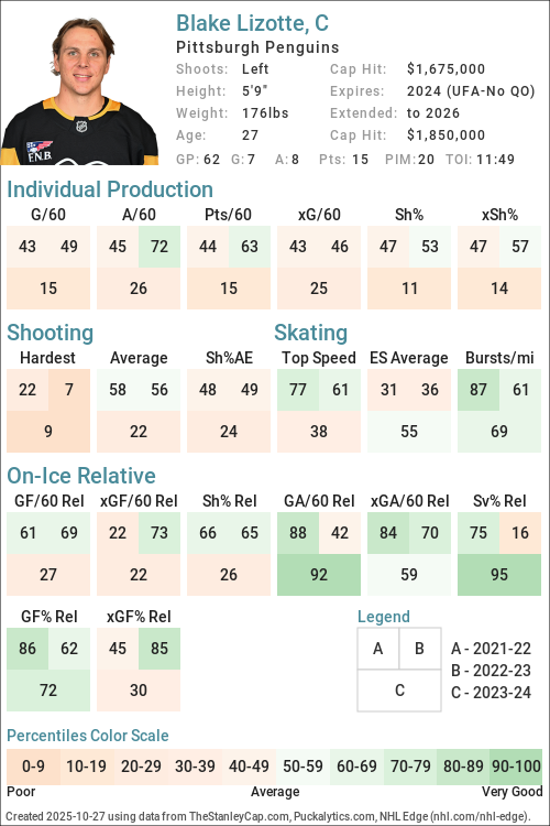 | 2024-25 | PIT | 59 | 644:19 | 33.90 | 1.96 | 1.80 | 38.37 | 2.33 | 2.28 | 45.65 | 44.14 | -0.78 | -0.18 | -7.09 |