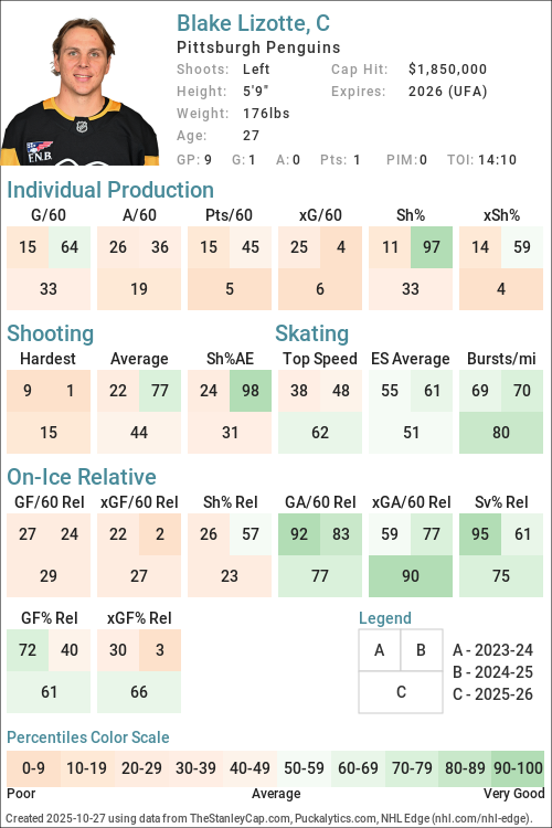 | 2025-26 | PIT | 9 | 99:37 | 37.95 | 1.81 | 2.28 | 40.35 | 1.20 | 2.13 | 60.00 | 51.75 | -0.33 | -0.64 | 3.16 |