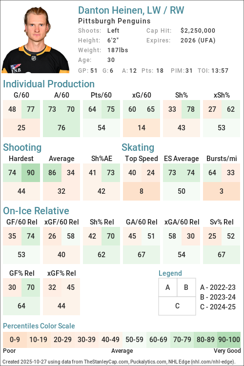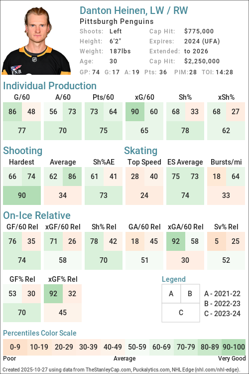 | 2022-23 | PIT | 65 | 639:01 | 41.78 | 2.35 | 2.67 | 41.88 | 2.72 | 2.57 | 46.30 | 50.92 | -0.27 | -0.06 | -1.81 |