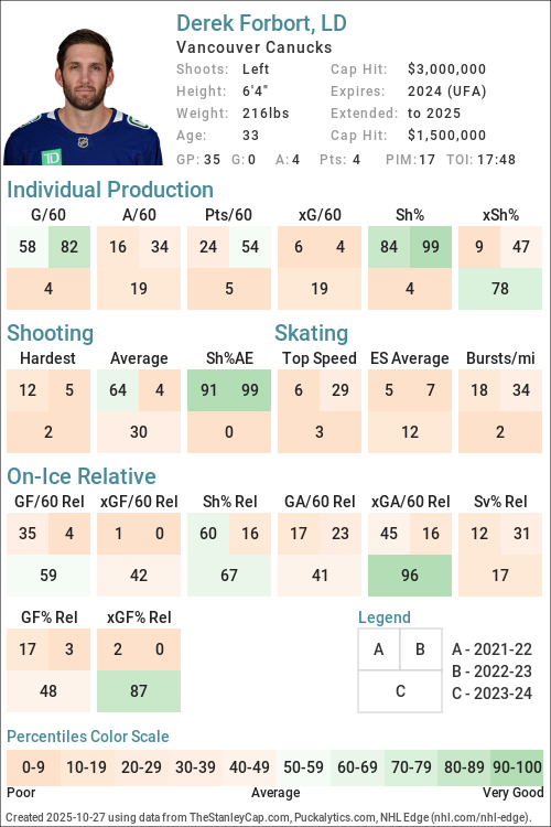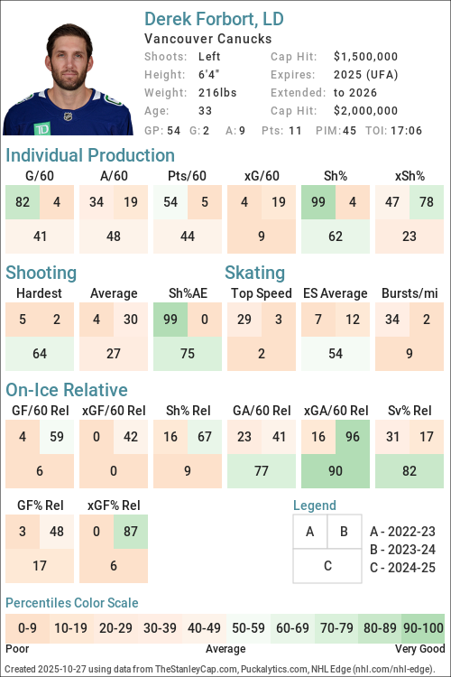 | 2024-25 | VAN | 54 | 773:10 | 32.83 | 1.55 | 1.66 | 38.72 | 2.17 | 2.10 | 41.67 | 44.11 | -0.73 | -0.32 | -5.61 |