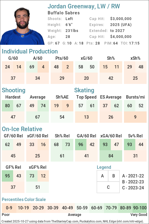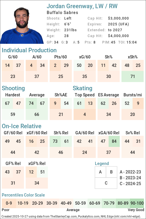 | 2024-25 | BUF | 34 | 399:33 | 43.70 | 2.70 | 2.26 | 41.15 | 3.00 | 2.50 | 47.37 | 47.50 | -0.04 | 0.07 | -1.17 |