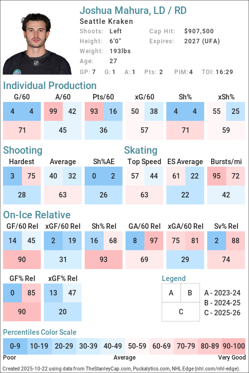 Percentiles are determined by comparing Forwards to Forwards and Defensemen to Defensemen.