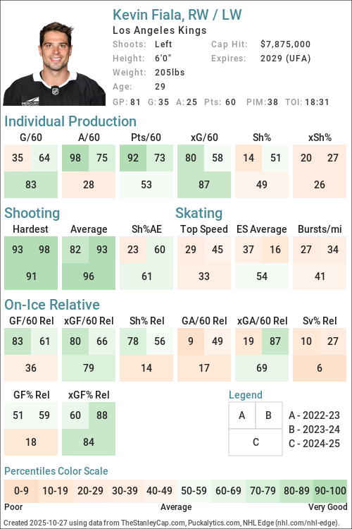 | 2024-25 | LAK | 81 | 1173:25 | 48.22 | 2.45 | 2.70 | 35.38 | 2.15 | 1.99 | 53.33 | 57.52 | 0.30 | -0.11 | 4.19 |