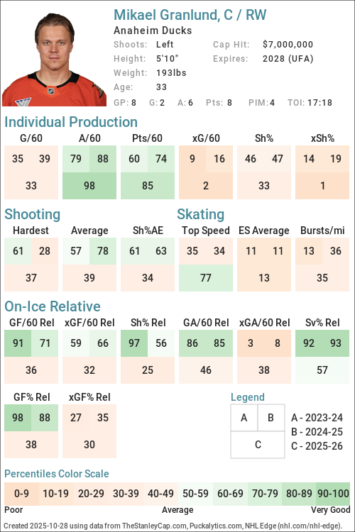 | 2025-26 | ANA | 8 | 91:41 | 52.35 | 2.62 | 2.30 | 53.66 | 3.27 | 3.00 | 44.44 | 43.34 | -0.27 | 0.17 | -4.17 |