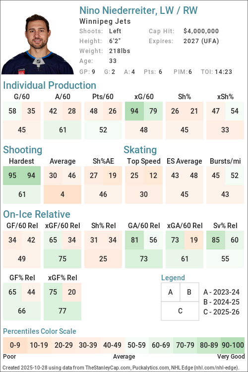 | 2025-26 | WPG | 9 | 108:34 | 0.55 | 1.11 | 1.66 | 0.62 | -0.06 | 8.33 | 9.28 | -0.95 | 0.00 | 15.38 |