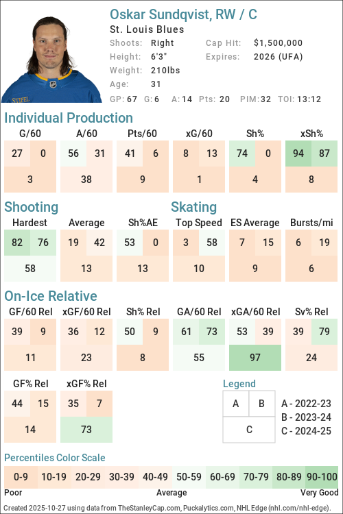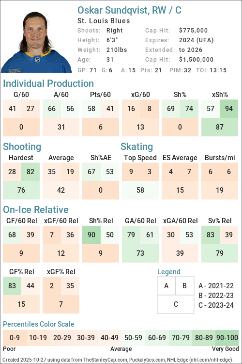 | 2021-22 | STL | 41 | 446:23 | 33.87 | 2.96 | 2.01 | 46.37 | 2.02 | 2.89 | 59.46 | 41.05 | -0.49 | 0.16 | -6.82 |