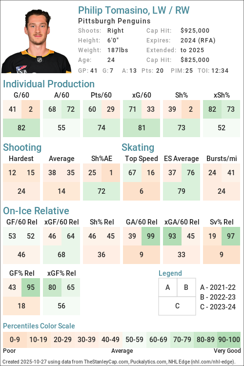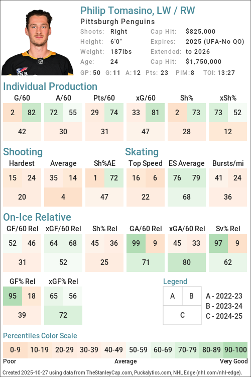 | 2024-25 | NSH, PIT | 61 | 692:22 | 40.82 | 1.91 | 2.43 | 40.21 | 2.60 | 2.30 | 42.31 | 51.34 | 0.02 | -0.20 | 2.31 |