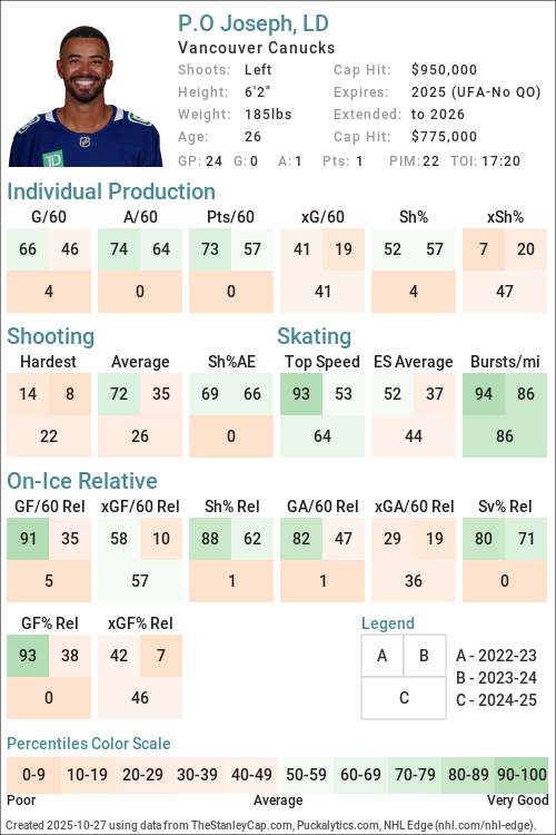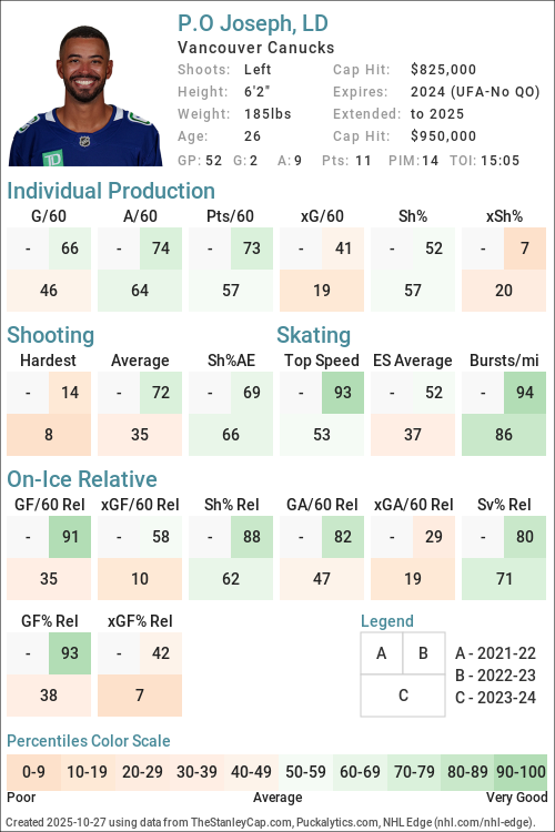 Percentiles are determined by comparing Forwards to Forwards and Defensemen to Defensemen.