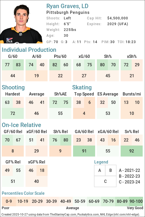 | 2023-24 | PIT | 70 | 1113:07 | 44.58 | 1.99 | 2.61 | 44.74 | 2.05 | 2.64 | 49.33 | 49.65 | -0.17 | -0.03 | -1.23 |