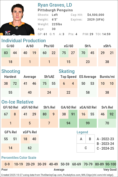 | 2024-25 | PIT | 61 | 796:15 | 38.05 | 1.58 | 2.20 | 39.64 | 2.49 | 2.21 | 38.89 | 49.91 | -0.45 | -0.52 | 0.65 |