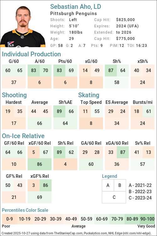 - Percentiles are determined by comparing Forwards to Forwards and Defensemen to Defensemen.
