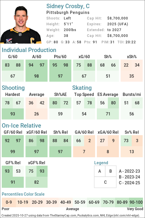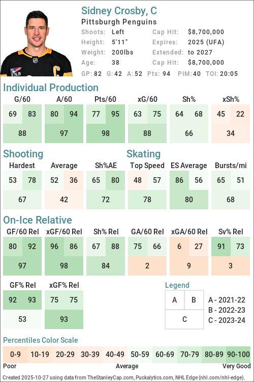 | 2023-24 | PIT | 82 | 1239:42 | 54.35 | 3.63 | 3.42 | 46.75 | 3.53 | 2.91 | 50.68 | 53.97 | 1.06 | 0.37 | 5.89 |