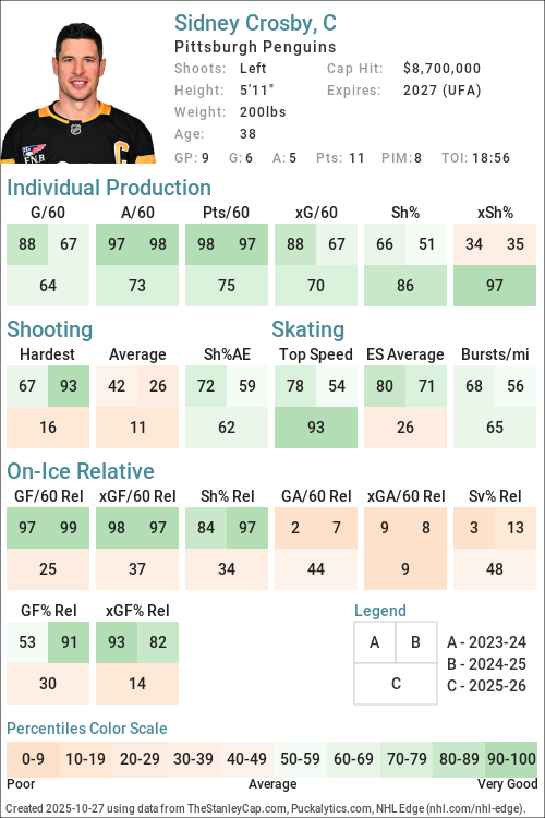 | 2025-26 | PIT | 9 | 135:29 | 37.20 | 1.77 | 2.39 | 48.71 | 2.21 | 3.09 | 44.44 | 43.62 | -0.22 | 0.66 | -8.22 |