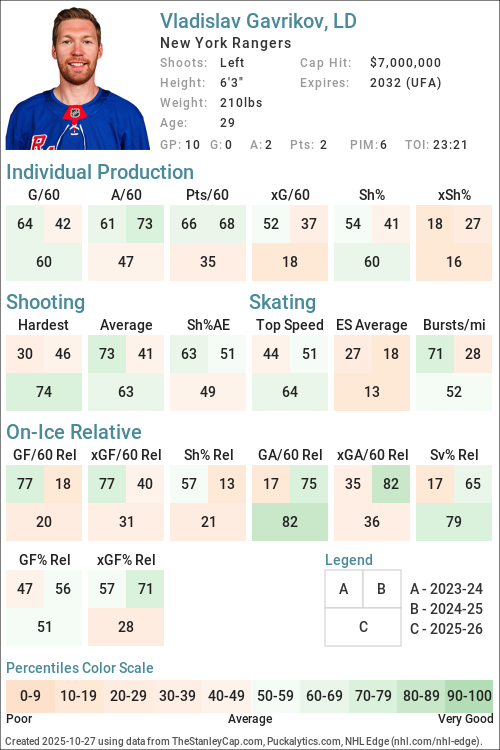 | 2025-26 | NYR | 10 | 206:25 | 42.73 | 1.16 | 2.25 | 36.33 | 1.16 | 2.06 | 50.00 | 52.20 | -0.27 | 0.14 | -4.53 |
