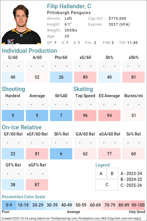 | 2025-26 | PIT | 7 | 71:29 | 40.29 | 1.68 | 3.07 | 39.45 | 1.68 | 2.20 | 50.00 | 58.27 | 0.66 | -0.40 | 10.16 |
