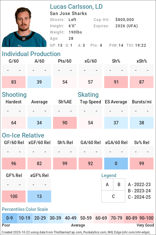 Percentiles are determined by comparing Forwards to Forwards and Defensemen to Defensemen.